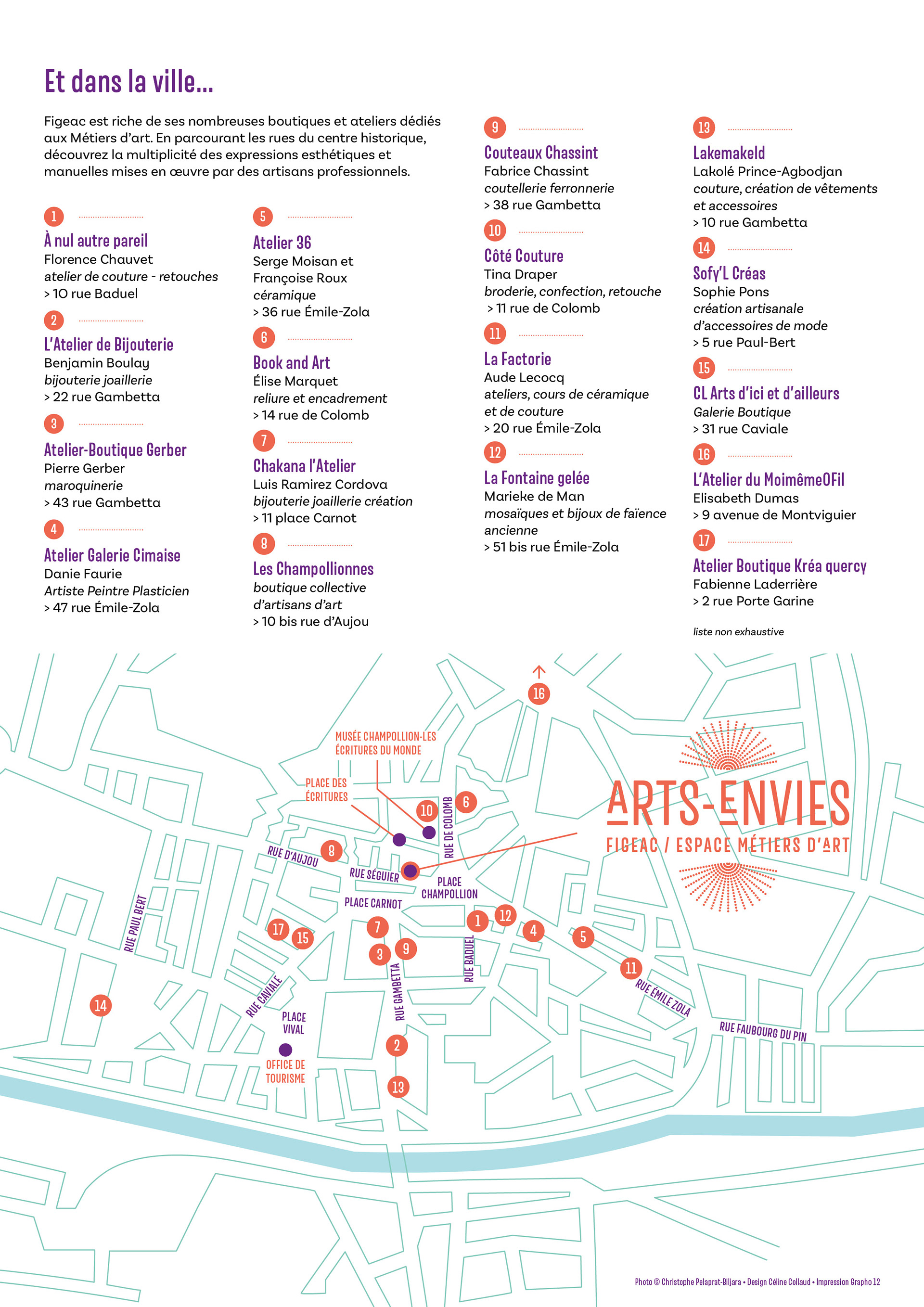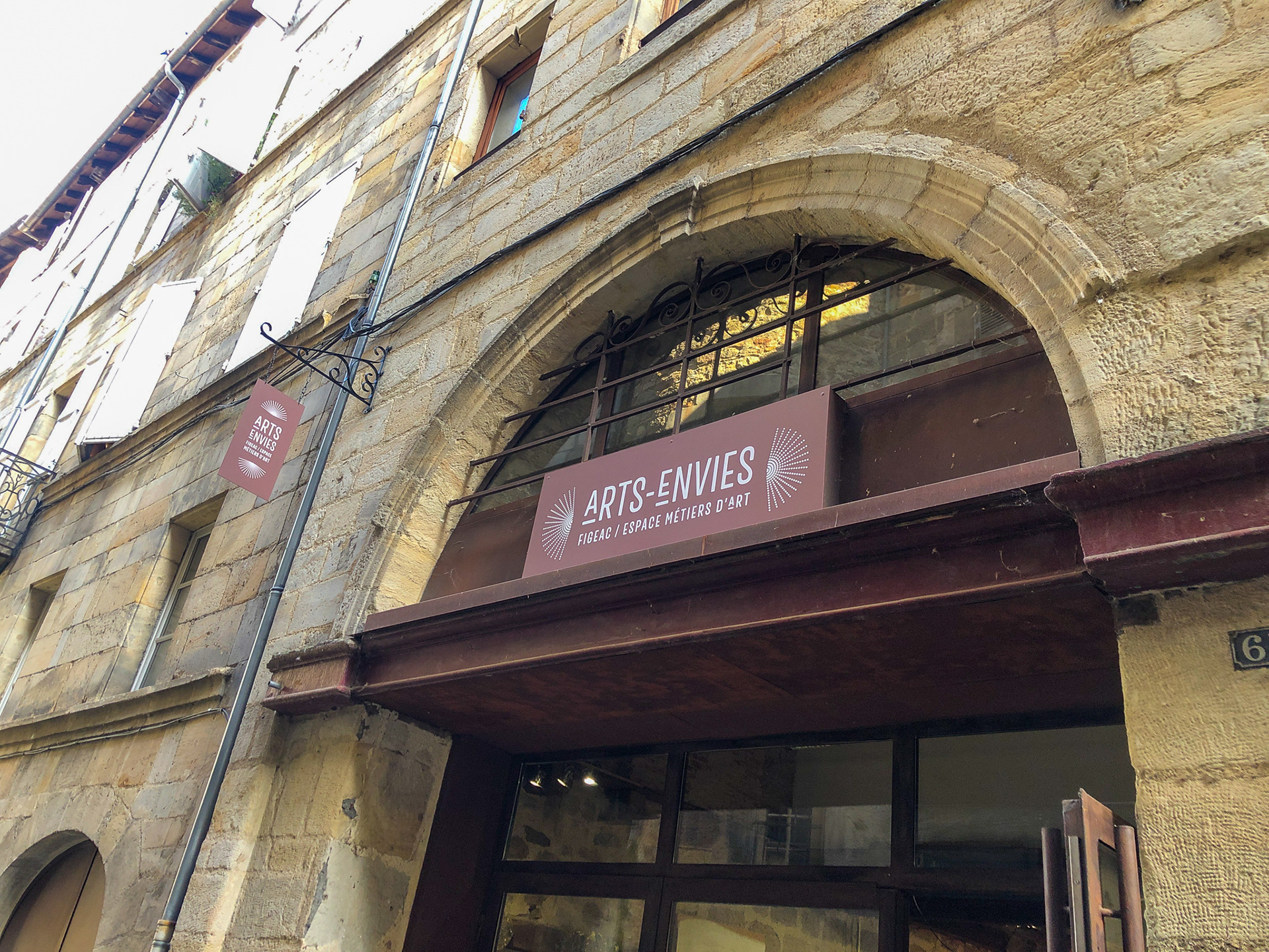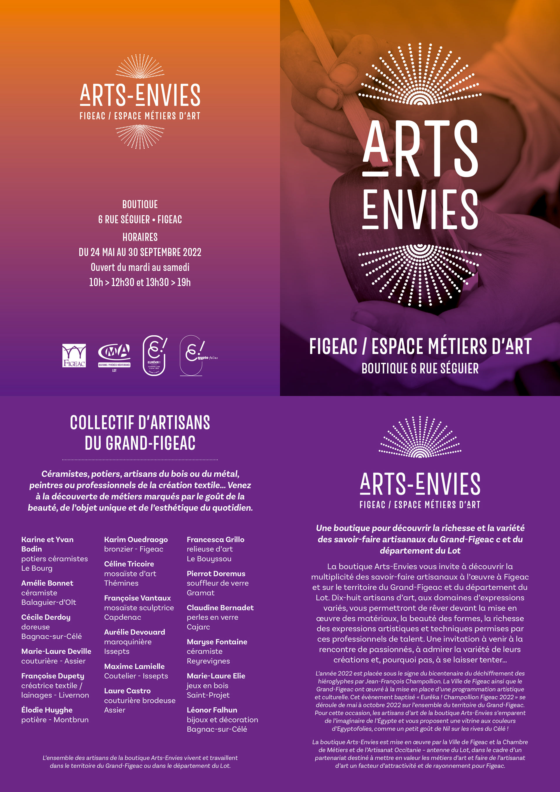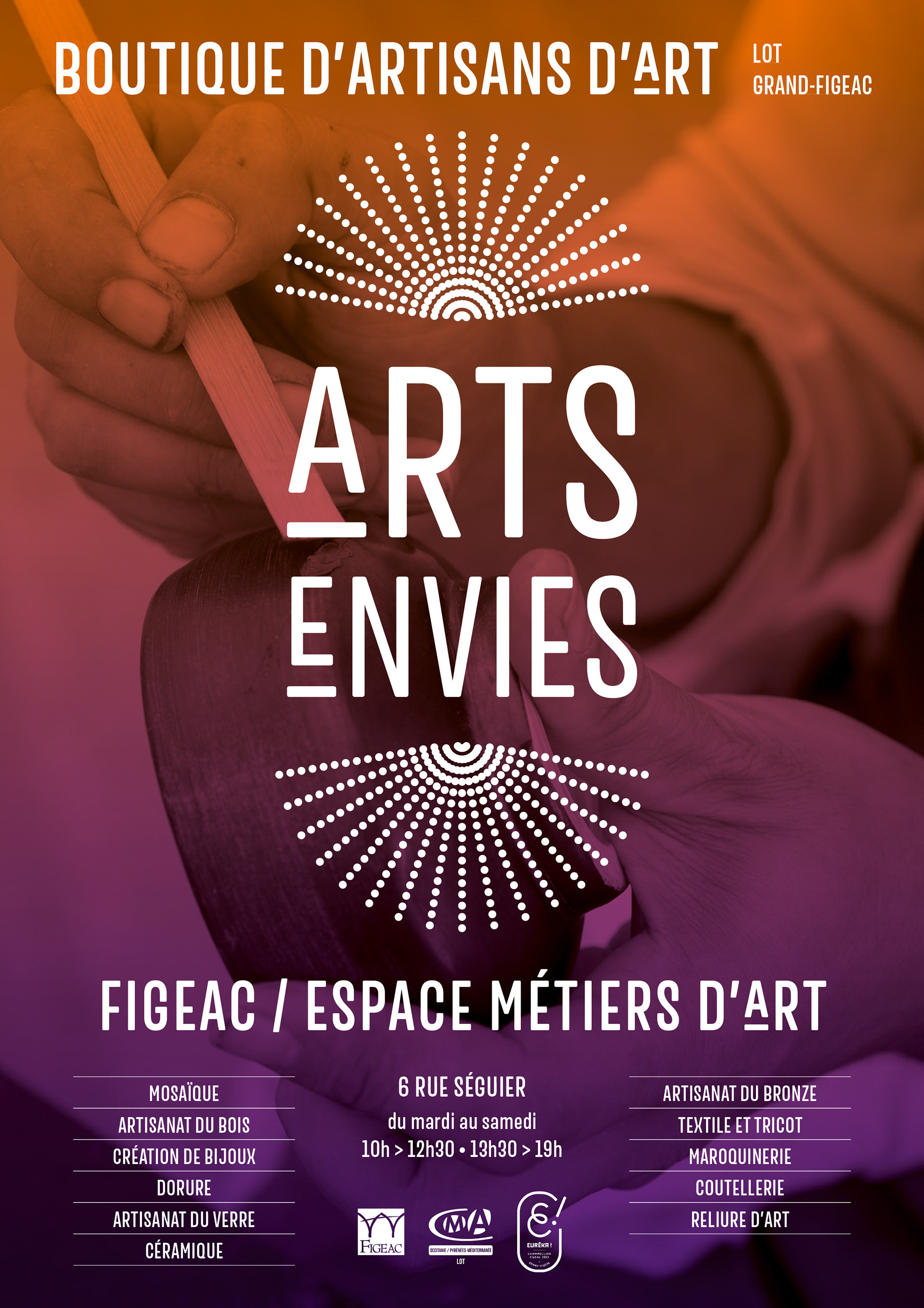 Identité visuelle polymorphe pour la boutique des métiers d'art du Grand-Figeac. Déclinaisons print et signalétique
