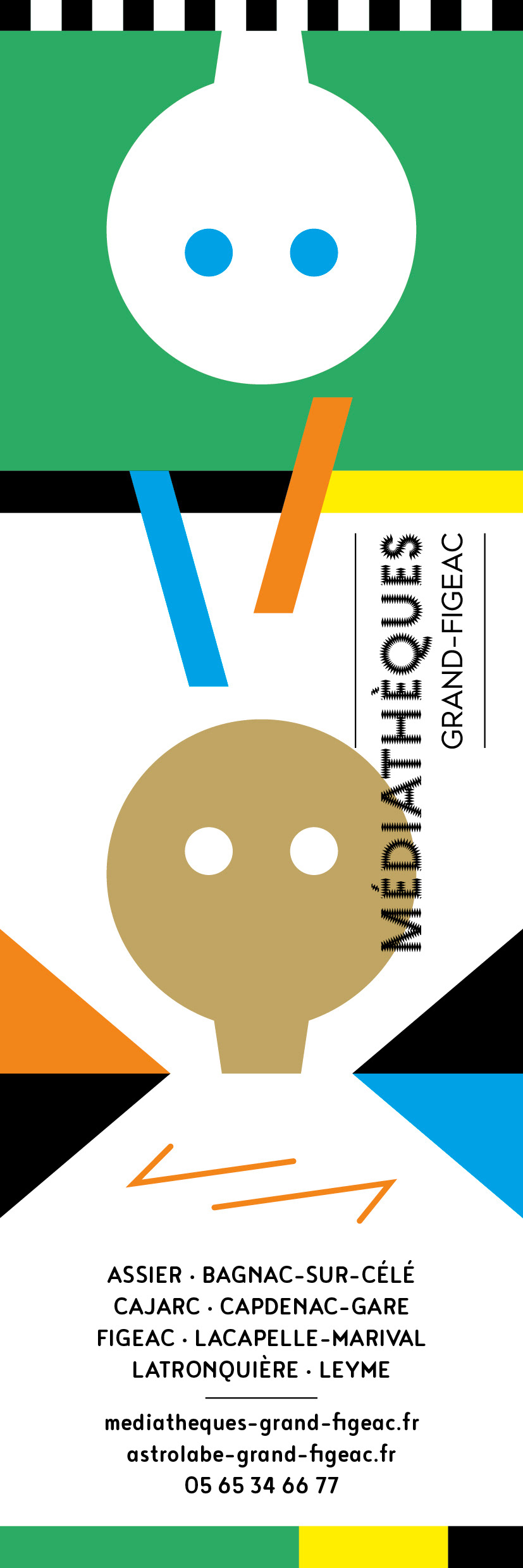 Série d'outils pour la communication des médiathèques du Grand-Figeac : marque-pages, affiches événements. Visuels déclinés de la saison culturelle de l'Astrolabe.