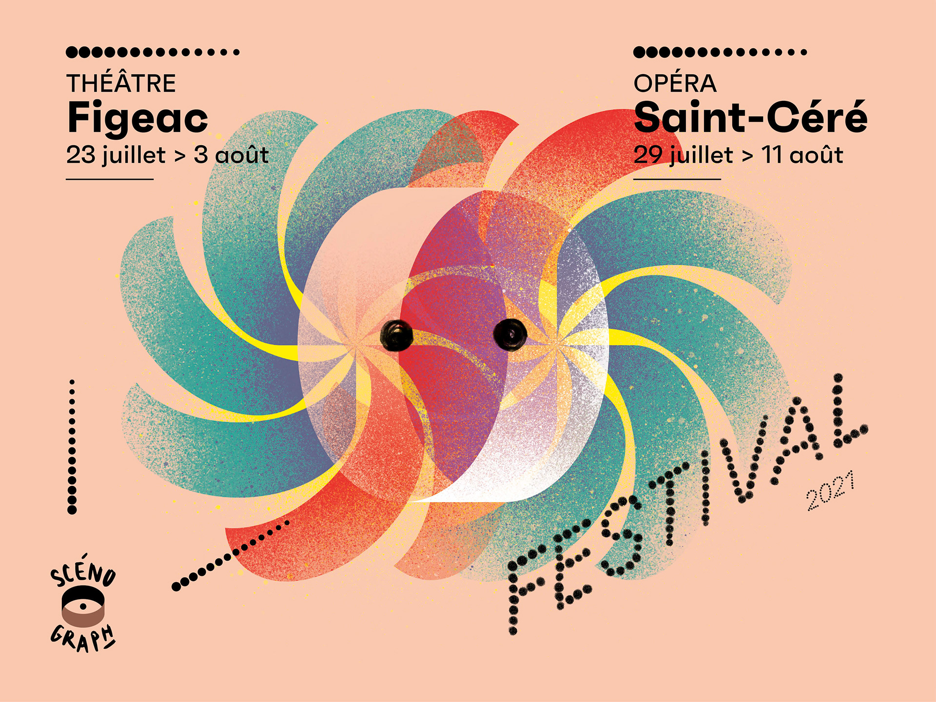 Visuel générique et charte graphique pour le festival de théâtre de Figeac et d'opéra de Saint-Céré, coordonné par le Scénograph, scène conventionnée